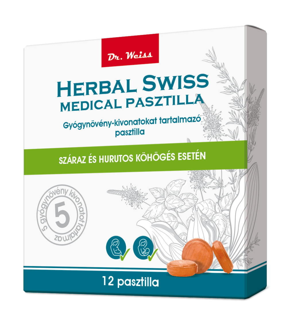 A Herbal Swiss Medical Pasztilla 5 gyógynövény egyedülálló kombinációját tartalmazza (Lándzsás útifű, Indiai tömjén, Kakukkfű, Bazsalikom, Eukaliptusz), amelyek segítenek enyhíteni a megfázással kapcsolatos tüneteket: