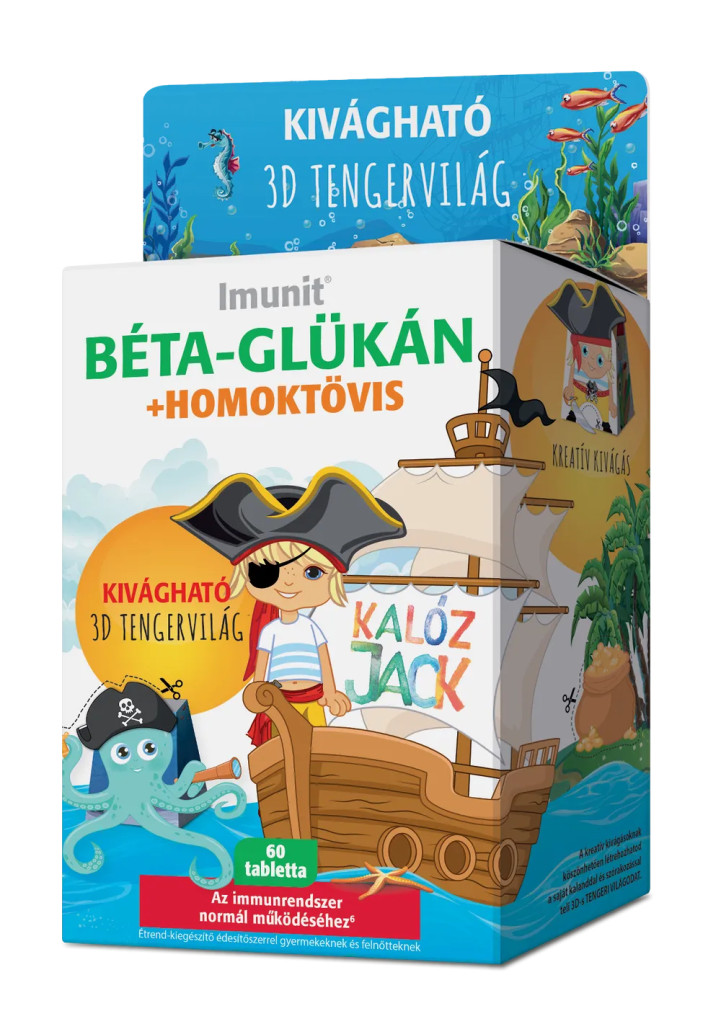 Imunit Kalóz Jack béta-glükán és homoktövis-kivonat tartalmú szájban oldódó tabletta vitaminokkal és nyomelemekkel. Szamóca ízű étrend-kiegészítő édesítőszerrel, gyermekeknek és felnőtteknek. Az immunrendszer normál működéséhez.